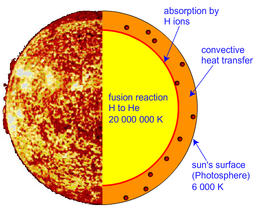 The sun is a hot sphere of gas whose internal temperatures reach over 20 million degrees kelvin due to nuclear fusion reactions at the sun's core which convert hydrogen to helium. The radiation from the inner core is not visible since it is strongly absorbed by a layer of hydrogen atoms closer to the sun's surface. Heat is transferred through this layer by convection[1]