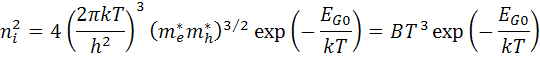 In the above equation, many of the parameters have some temperature dependance, but the most significant effect is due to the intrinsic carrier concentration, ni. The intrinsic carrier concentration depends on the band gap energy (with lower band gaps giving a higher intrinsic carrier concentration), and on the energy which the carriers have (with higher temperatures giving higher intrinsic carrier concentrations). The equation for the intrinsic carrier concentration is;