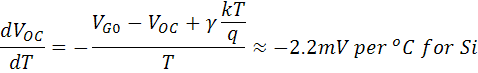 The above equation shows that the temperature sensitivity of a solar cell depends on the open circuit voltage of the solar cell, with higher voltage solar cells being less affected by temperature. For silicon, EG0 is 1.2, and using γ as 3 gives a reduction in the open-circuit voltage of about 2.2 mV/°C;