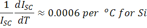 The short-circuit current, Isc, increases slightly with temperature, since the band gap energy, EG, decreases and more photons have enough energy to create e-h pairs. However, this is a small effect and the temperature dependence of the short-circuit current from a silicon solar cell is;