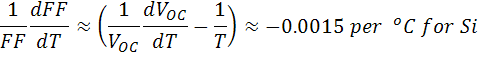 where B' is a temperature independent constant. A constant , γ, is used instead of the number 3 to incorporate the possible temperature dependencies of the other material parameters. For silicon solar cells near room temperature, I0 approximately doubles for every 10 °C increase in temperature.